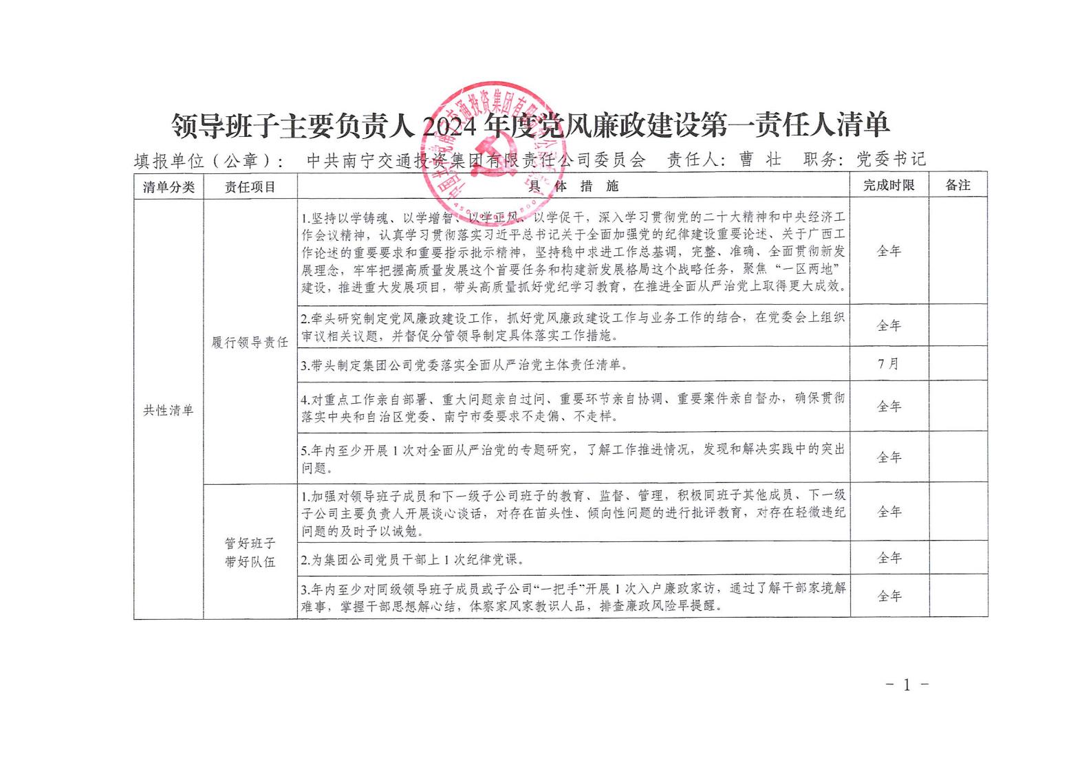 領(lǐng)導(dǎo)班子主要責(zé)任人2024年度黨風(fēng)廉政建設(shè)第一責(zé)任人清單