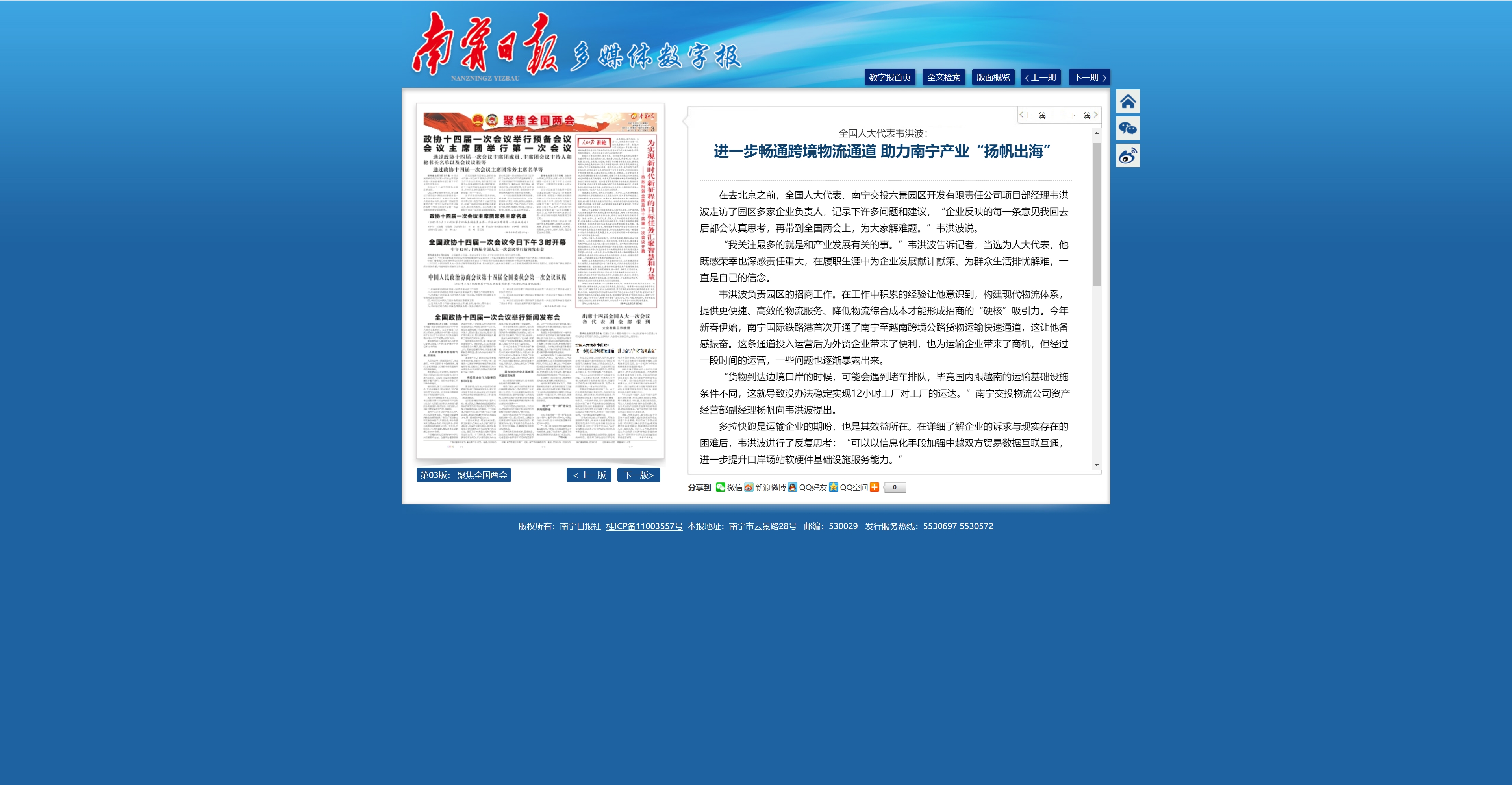 全國人大代表韋洪波:進一步暢通跨境物流通道 助力南寧產業(yè)“揚帆出?!?/h1>